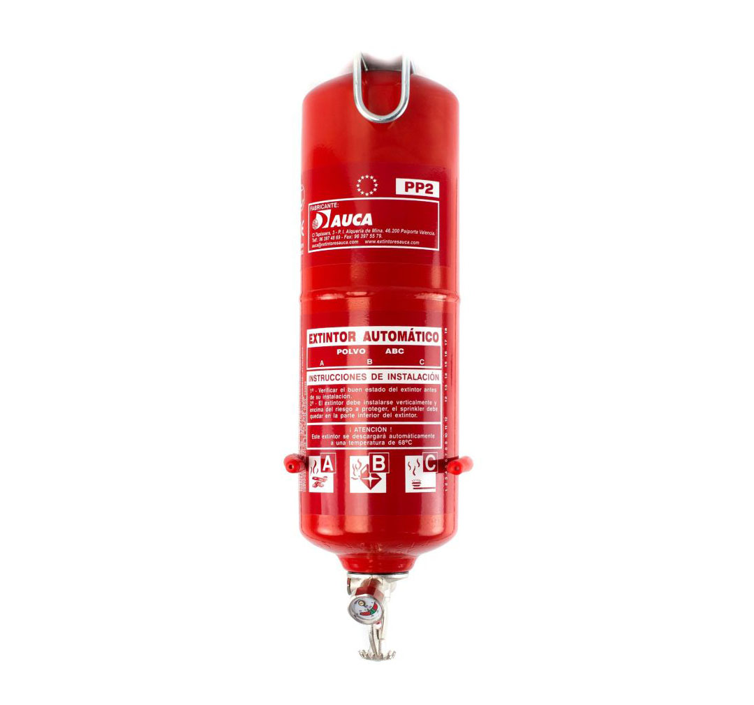 Recipiente automático, el extintor permite actuar en ausencia de presencia humana ante un incremento de temperatura por encima de los 75ºC. Agente extintor polvo polivalente ABC que asegura su eficacia sobre fuegos secos, clase A, y fuegos líquidos o de gases, clase BC. El extintor puede ser utilizado con tensiones eléctricas inferiores a 35.000 Voltios. Las temperaturas limite de funcionamiento son -20ºC y +60ºC. Comercializamos extintores portátiles automáticos de 6 y 9 kgs.